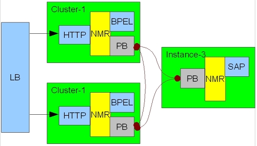 - 如果NMR获得对BPEL资源的HTTP请求,这时在本地BPEL实例或远程BPEL实例之间需要进行选择。缺省情况下,本地实例会比远程实例优先选择,该决策的作出并不涉及考虑代理绑定组件。如果本地BPEL因异常失效了,请求将会被路由到剩下的实例上。