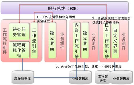 Web 服务方式交互;内嵌的工作流管理模块,业务组件通过 API 的方式调用内嵌在业务组件中的工作流引擎,工作流引擎和公共的工作流引擎共享数据库;公共工作流管理组件和内嵌工作流模块组合,工作流引擎有自己的流程数据库,包含已有系统的工作流引擎有自己的流程数据库,工作流引擎和业务组件紧密集成,通过