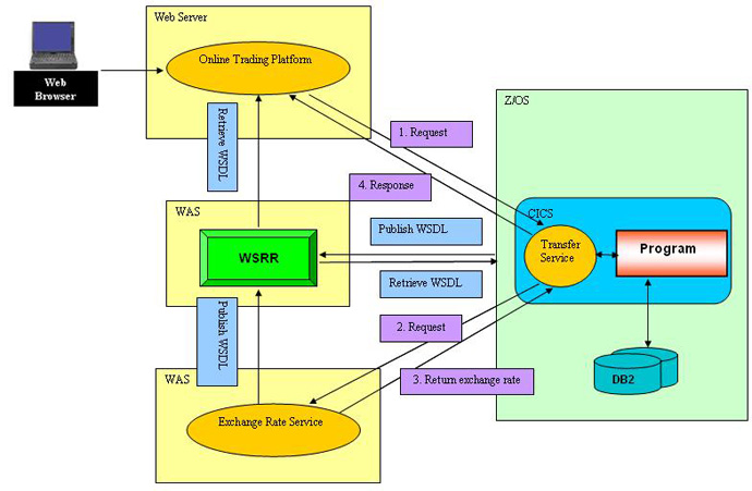 通过引入 SOA 架构的思想,将 CICS 上原本耦合性很强的转账服务拆分成汇率服务和转账服务。通过