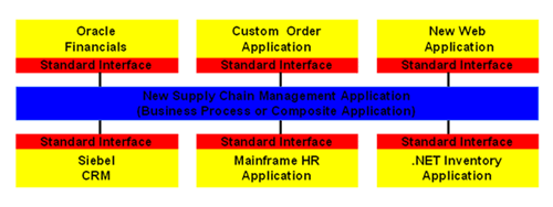 如图1的例子所示,一个使用SOA的企业,可以使用一组现有的应用来创建一个供应链复合应用(supply