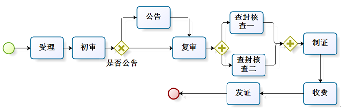 如图3.9所示,在“查封核查一”和“查封核查二”两个活动之后,房改购房审批流程通过一个“并发汇聚”网关,继续向下流转到“制证”活动上。
