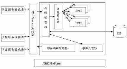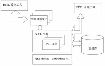 具可用J2EE、.NET等作为实现平台。Web Service的运行环境则为BPEL流程提供了服务的发布,查询,调用等功能。BPEL则关注于定义流程逻辑,实例关联,错误处理,事件处理,变量定义
