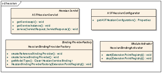 Binding的服务提供者实现和引用者实现,后者是作为注册到服务框架中去的接入点。ASFHessianServlet在第一次开发过程中是没有实现的,直接采用HessianServlet去处理远端Hessian请求,但是在后续的测试过程中发现了问题,就扩展了HessianServlet,后面会提到此问题。ASFHessianConfigurator是对Hessian服务提供者提供一些必要的配置信息。