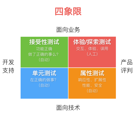 测试从不同的维度可以划分(参考[2])如下四个象限,四个象限从不同维度视角对测试做了???察和判断,从中可以看出除了体验和探索性测试需要人工介入,其他维度的测试都可以通过自动化来实现,以降低测试人工成本和重复性工作。