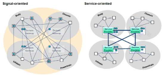 面向信号的设计主要关注点为通信矩阵(包含信号、报文、节点等信息),主要目的是将某节点的某信息通过总线传输给需要改信息的其他节点,信息主要为一些物理状态值及一些控制指令,触发方式分为周期、事件或混合式。面向信号的设计在系统设计阶段就预先定义好交互行为。SOA的中间件负责控制提供者和消费者之间的通信。中间件分离了应用层与底层通信协议,支持请求/响应模式,有需求才有通信,有效提高带宽利用率。支持在服务接口中定义复杂的数据类型。