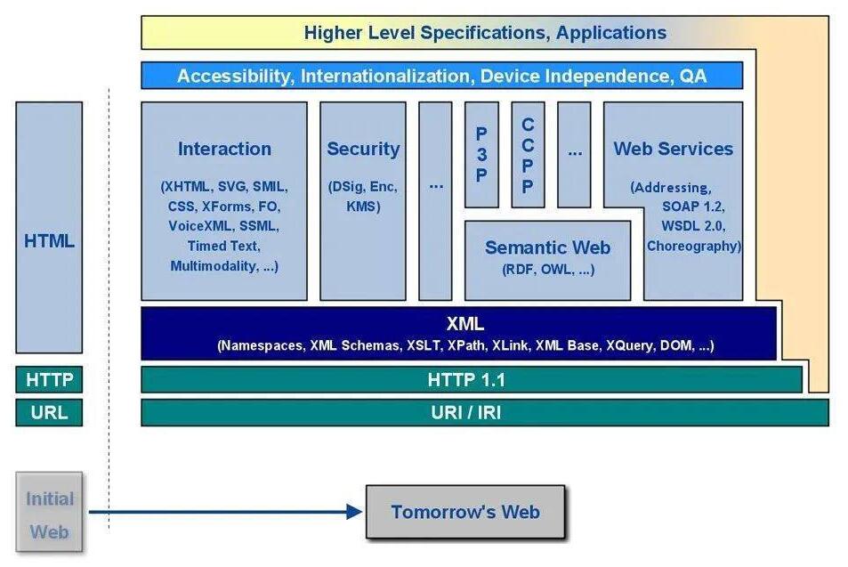 进入千禧年后,随着以Web为代表的互联网经济的兴起,各种电子商务业务得到迅速的发展,各大企业面临消减成本和随需应变这2个问题,SOA恰恰能满足集成各种异构系统及高度的灵活性可用性,因此重新受到人们的关注。下图是2008年W3C发布的Web技术发展展望,可以看到当时同时伴随着XML,