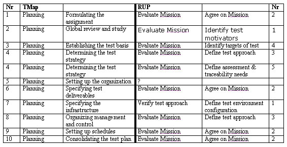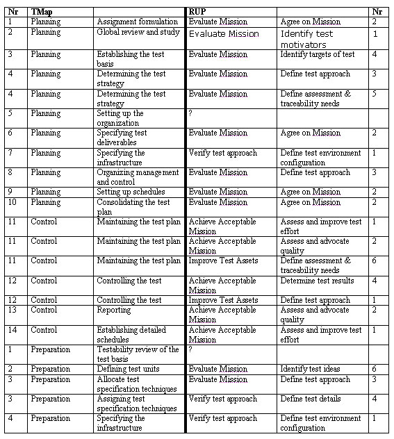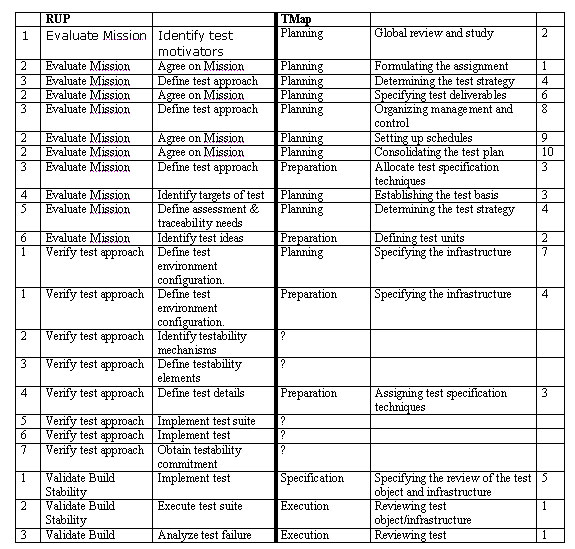 下面的两个表在详细层次上对比了RUP和TMap的活动。第一个表说明了与RUP活动相连的每个阶段的TMap活动。当没有清晰的关系时,这个域已经被标记了一个问题标记(?)。请考虑,一个RUP活动可以出现在多个工作流上。在许多情况下,一个工作流的活动可以被映射到一个TMap活动上是很清楚的,但是相同的活动不能被映射到一个不同的工作流上。这种情况的一个例子是测试和评价中的“定义测试明细”,其可以被映射到TMap规格说明阶段中的“准备测试规格说明”。相同的活动“定义测试明细”也出现在“改善测试资产”和“验证测试方法”上。在这些情况下,匹配的TMap活动还没有被填充。