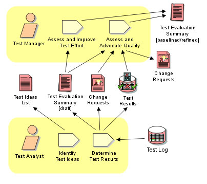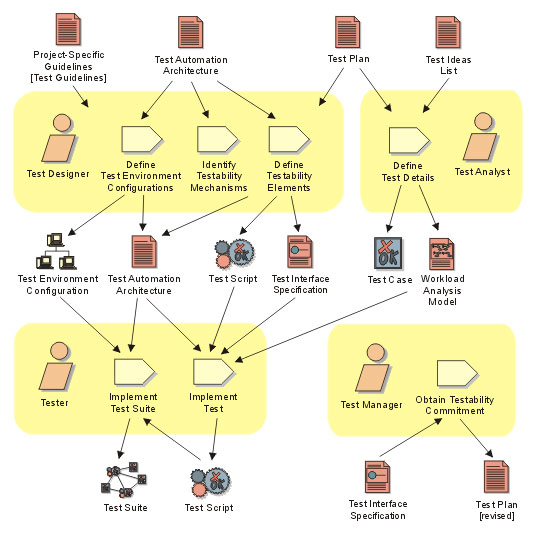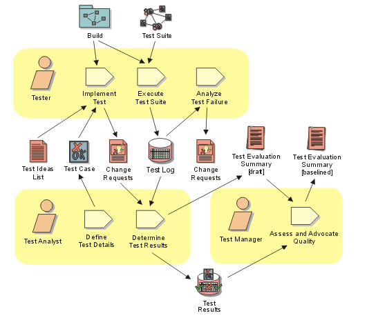 对于每个项目,实现流程的方式--意味着被选择的活动子集和工件,相关的角色,以及谁来实现这些角色--在开发用例和软件开发计划中规定。这也可以应用于测试流程。履行测试设计员角色职责的人员决定测试指南。测试经理负责指南集中的系统测试的执行,并管理不同的测试角色(谁,做什么,以及什么时间)。其他角色包括测试分析师和测试人员。在每个角色中,都要描述职责、相关技能和可能的任务(包括可能的任务合并)。考虑到提前展开的任务的数量,每个项目的所有角色需要进行充分地分配,因此对于测试团队的成员,就可能共享角色和/或参与到多个项目中。