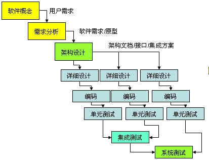 架构设计是软件开发中一个重要的关注点.因此在RUP中也提及到软件开发要以架构为核心.因此在架构设计完成后系统会被分为相关的子系统和功能模块.每个功能模块间的接口都可以定义清楚.在这种情况下,当模块B的详细设计做完成后往往就没有必要等到其它模块的详细设计都要完全作完才开始编码,因此在架构设计完成后可以将系统分为多个模块并行开发,每个模块仍然遵循先设计和编码测试的瀑布模型思路.这是瀑布模型的一种最重要的改进思路,也可以说这是一种增量开发的模型.