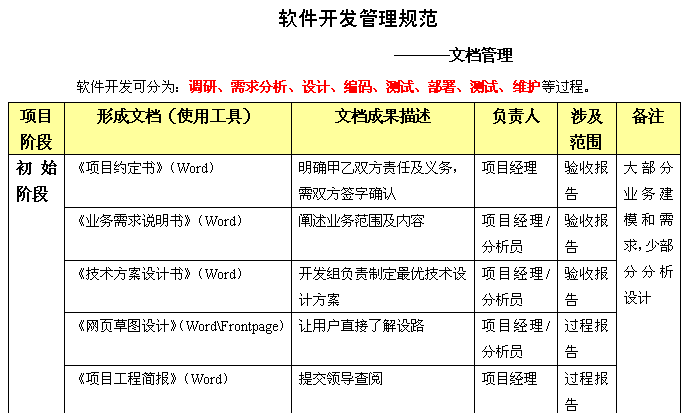 摘项目管理的根本目的是按时、保质、保量完成预期交付的成果。项目管理要让整个组织能清楚理解项目实施的目的、影响、进度,应做到项目组所有员工都应理解项目实施的原因、意义及客户的要求。在项目管理中还能看到公司高层领导通过实际行动表现出来的对于项目实施的支持与帮助,通过以制度化管理来组织合理安排员工的工作职责和角色转换。为满足上述要求,就必须让员工、企业、客户能接受并适应新的“软件项目开发管理规范”。