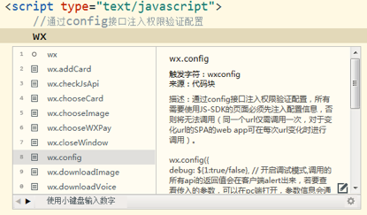 下图中敲wxc回车就能生成一段完整的微信API初始化的长长代码,还能给予各种参数的值域提示。