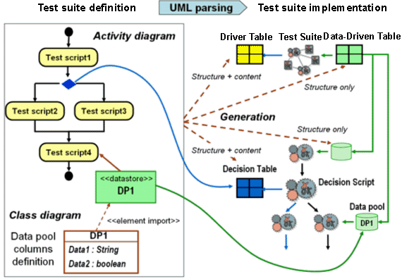 一个"datastore"类型的目标节点可以被连接到一个测试活动,来指定这个测试活动需要的一个数据池。通过类指定数据池结构也是可行的方案。数据池的每一列都会和一个类的属性通信。一个UML解析器可以产生所有Functional