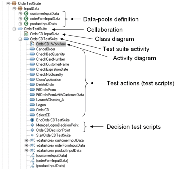 Tester运行测试套件所需的数据池,包括驱动表,决策表和数据驱动表和测试脚本数据池的结构。活动图表和类图都可以在一个协作元素下组织起来,如图11所示。可追溯的连接可以在测试套件定义和用例模块之间建立,如图12所示。一个更加成熟的方法可以使用IBM