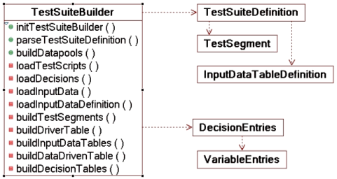 如图6所示,每一个测试套件的结构都在测试套件驱动表中描述了,一个数据池定义了测试脚本(例如从源脚本到目标脚本的转换)。次序并不重要,因为TestSuiteDriver类可以解析驱动数据池并且在存储器中加载测试套间的结构。然而,你必须定义开始和结束脚本。测试人员可以填写这个表格,来指定测试套件或者从测试套件的UML定义产生这个数据池(可以在稍后的章节查看"使用IBM