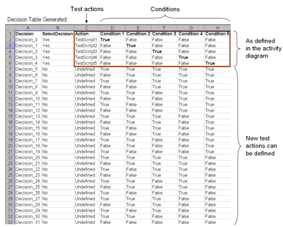 所有可能的选择都自动的产生在决策表数据池中,如图14所示。只产生了活动图中列出的测试活动。新的测试活动没有被列在活动图表中,但是可以在导入到Functional