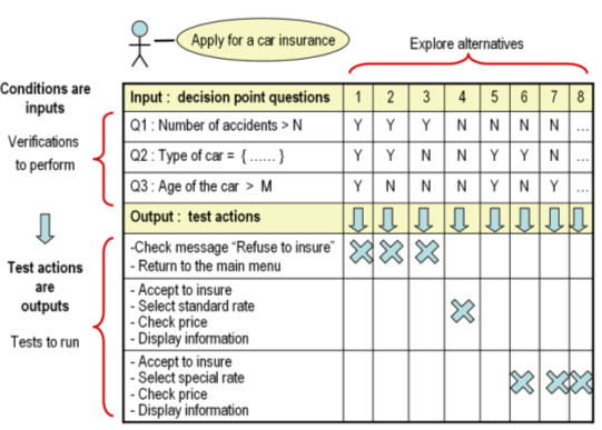 在测试过程中当达到一个决策点时,测试人员会检查AUT的状态并决定测试活动。每一个决策点都可以用一个决策表来指定。一个决策表由两部分组成:条件和活动。决策表列出了一个测试活动执行所需的条件。每一个条件表达了各种变量之间的关系是正确的还是错误的。所有可能的条件组合定义了一系列的选择。对于每一个选择,测试活动都要考虑到。选择的数量使得条件种类呈指数级增加,可能会显示为2NumberOfConditions。当决策表变得复杂时,一个新的决策表层级就会被创建。