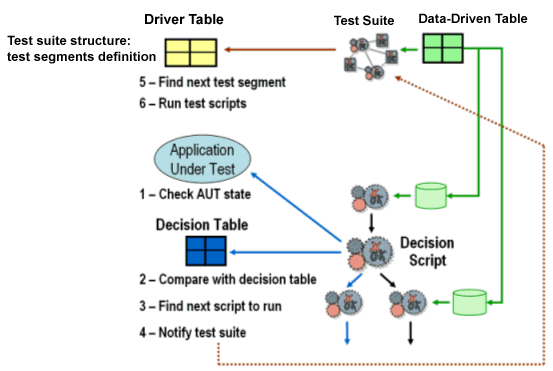 在每一个决策点,一个决策表要列出AUT(根据条件)需要校验哪些内容,以及下一个活动是什么。由于决策表中已经定义了逻辑,所以测试人员不需要硬编码任何测试逻辑。决策脚本只需在运行期间执行确认工作,比较决策表提供的验证结果,并且如果找到了解决方案,返回并运行下一个测试脚本。