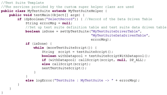 每一个测试脚本数据池通常包含一个标志,它用来显示测试脚本在数据池的完整回归过程中是否必须选择一项记录。当测试套件开始新的回归时,TestSuiteDriver类会读取测试套件驱动表,并设置测试脚本数据池选择标志位,所有测试脚本都会重复这项工作。因而,当一个测试脚本数据池记录发生回归时,只有驱动表中列出的记录会被考虑。这个机制被库文件管理,并且对于测试人员来说是完全透明的。唯一的约束就是所有数据池的SelectRecord标志位。