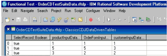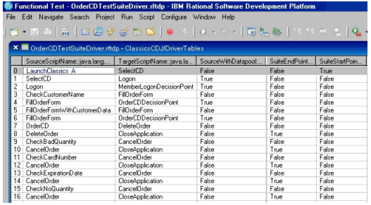 一个数据驱动表可以被连接到测试套件脚本,用来1) 控制数据输入到不同测试脚本以及2) 建立通过AUT的不同路径。数据驱动表的标题包含测试套件的测试脚本所使用的数据池的名称。数据驱动表的每一行表示一种不同的输入数据记录的整合,这个输入数据记录用在每一个测试脚本数据池中。如图7所示,数据驱动表的第一列是一个测试套件的true/false标志位,这个标志位用来表示一行是否依靠于测试对象。