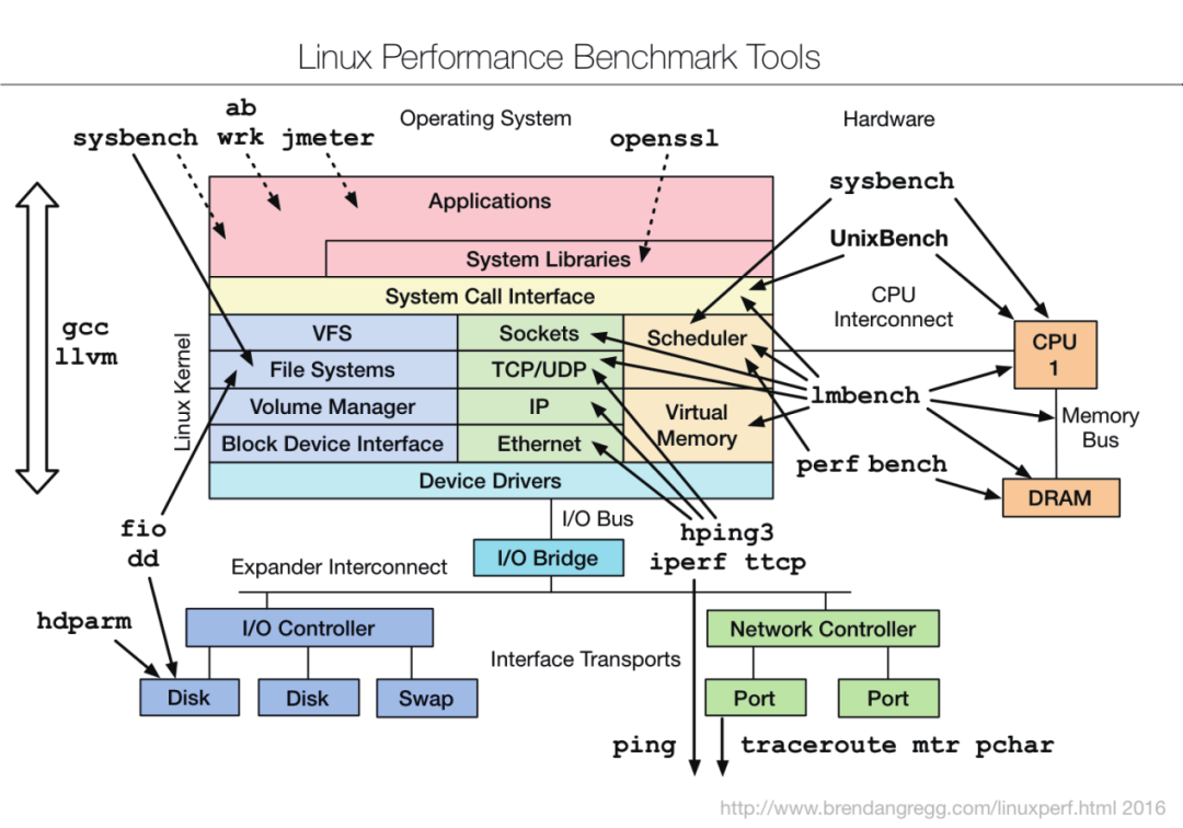 系统层面,比如Linux环境下,针对不同的系统组件存在不同的系统压测工具。最常见的是系统的sysbench组件包所包含的工具。下图是性能领域领域专家Brendan