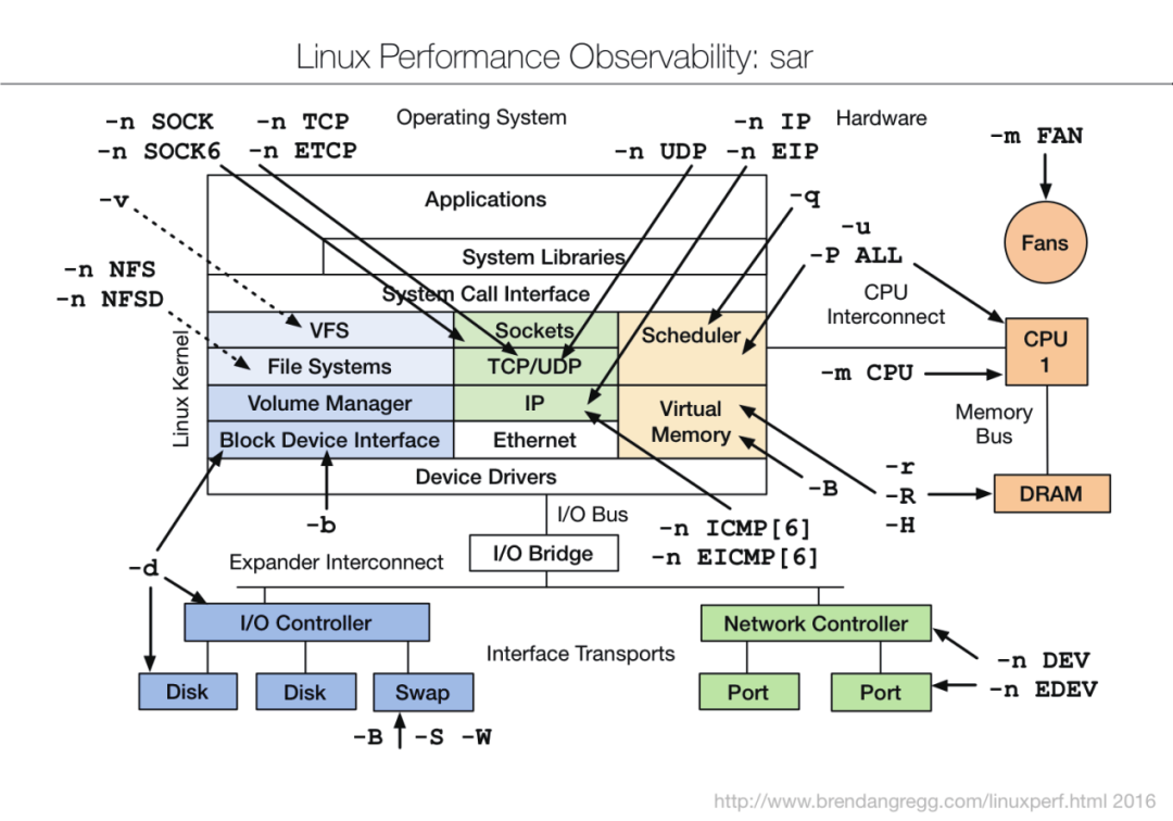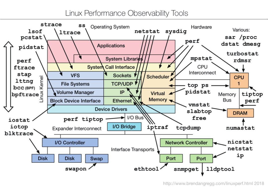 Gregg的提供linux system bench tools图,供参考。命令的详细用法可以通过man查阅。