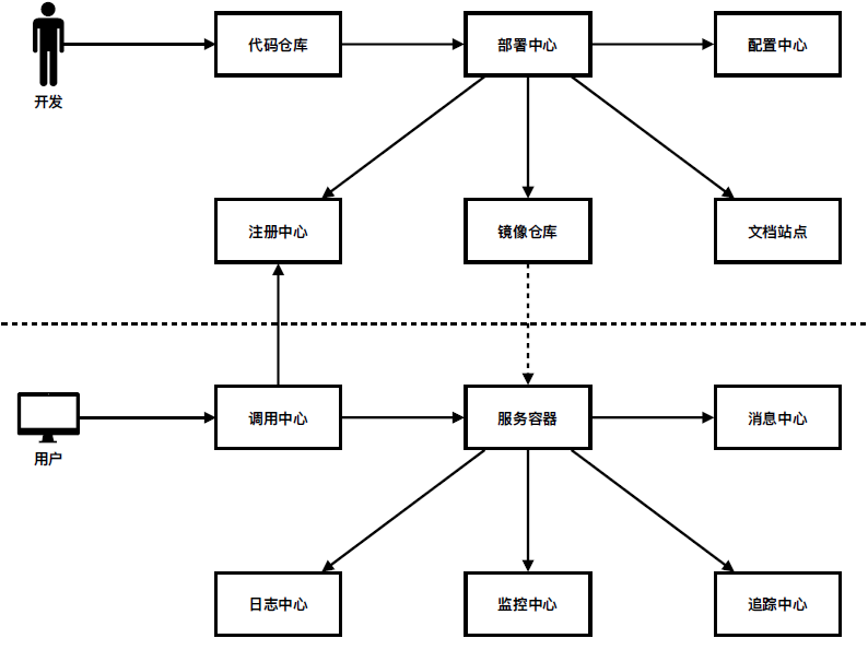 图1-12所示的架构图中包括12个组件,其中的代码仓库、部署中心、注册中心、镜像仓库、调用中心、服务容器这6个组件已在上册中进行描述,剩下的配置中心、文档站点、消息中心、日志中心、监控中心、追踪中心这6个组件将在下册后续章节中深入探索。