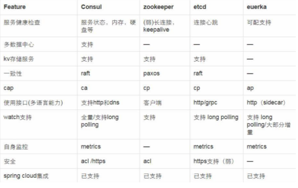关于Consul的更多介绍,比如优点,这里就不再赘述了,上网一搜就可以随处找到了。但是,必须贴一个和其他类似软件的对比: