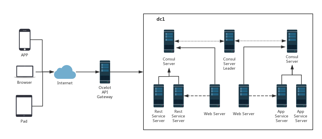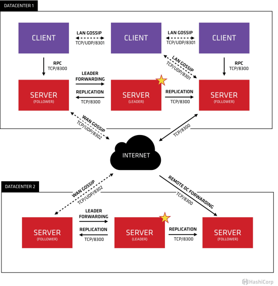 Consul支持多数据中心,每个数据中心的Consul Cluster都会在运行于Server模式下的Agent节点中选出一个Leader节点,这个选举过程通过Consul实现的raft协议保证,多个