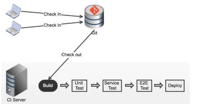 在单体时代,对于开发-测试-部署,业界已经具备了一套很成熟的解决方案。基于这种方案,当一个敏捷开发的小Team开始构建一个应用之前,CI搭建的过程也会变得非常简单:CI只需要从一个代码库中去pull代码,然后编译-测试-部署,它的流程可以简化成: