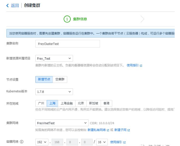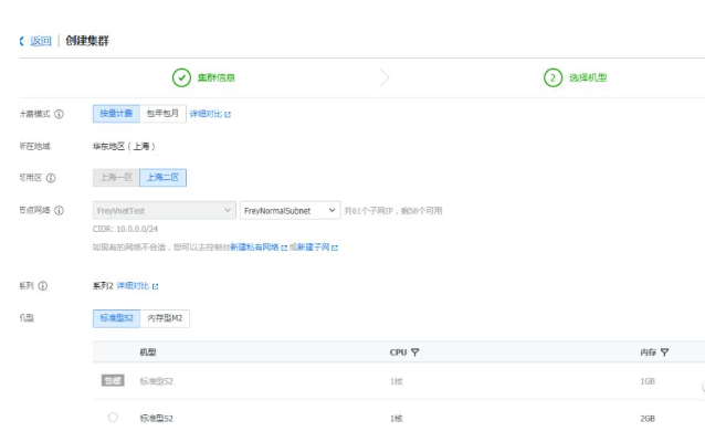 首先在容器CCS上创建集群,此集群包括两个集群节点,后面用来运行多个服务及容器。由于ElasticSearch需要至少2GB内存,我们选择两个节点都配置为2核4GB。
