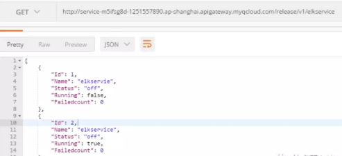 通过postman 查看API Gateway, 调用ELKService 接口, 可以查到elkservice的状态已经发生变化: