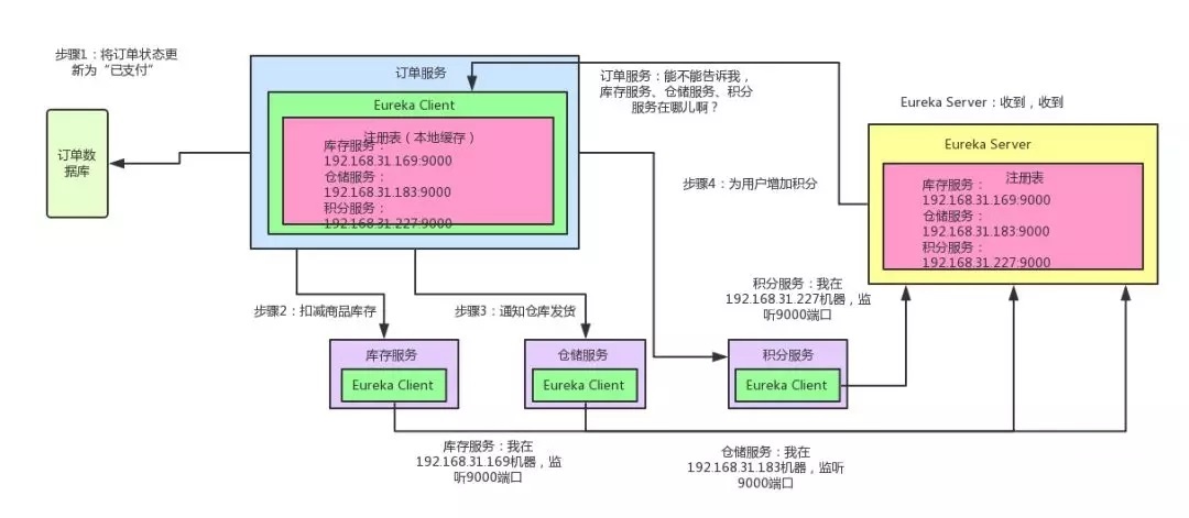 Server问一下:库存服务在哪台机器啊?监听着哪个端口啊?仓储服务呢?积分服务呢?然后就可以把这些相关信息从Eureka