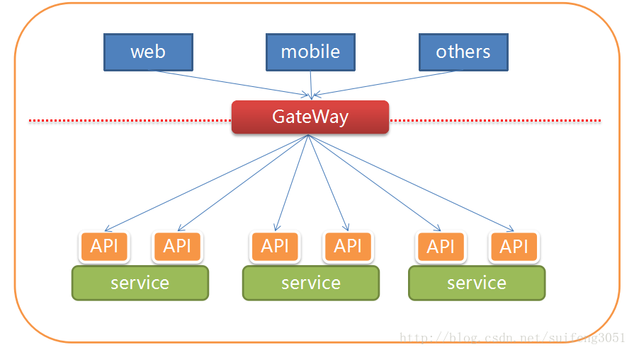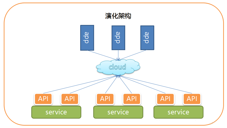 从上面这幅图看出,微服务特别简单(好的架构就应该简单),我们把服务再拆分成一个个API,API是一个完整的功能。然后我们把API扔到一个“云上”,然后用户就可以到“云上”获取所有API的服务,这个“云”保证能提供好的服务。