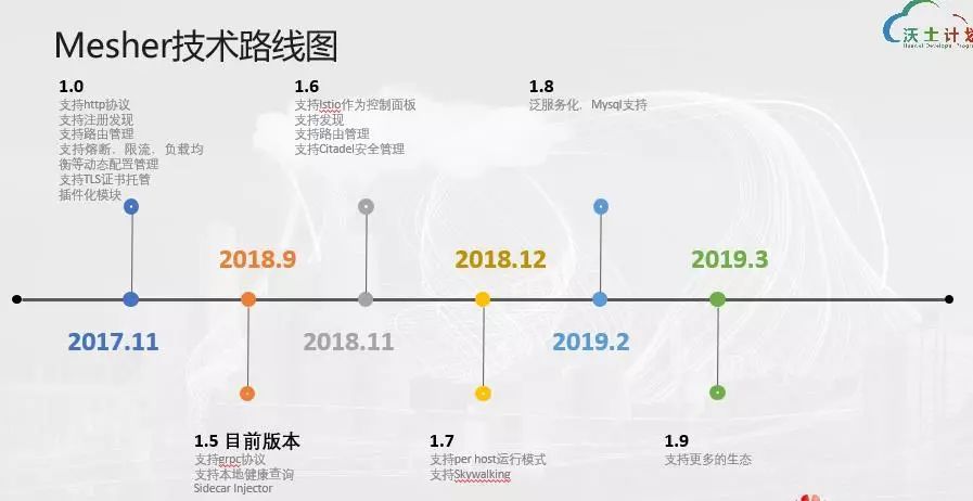 这个是Mesher的技术路线,实际上我们17年11月份的时候就发布了国内第一款商用级别的Service Mesh,基于我们过去的微服务经验,以及几年前做的类似Service Mesh的工作。后续我们又进行了一些迭代,在这一年的迭代中还同时帮助多家企业把Service Mesh带到生产中。