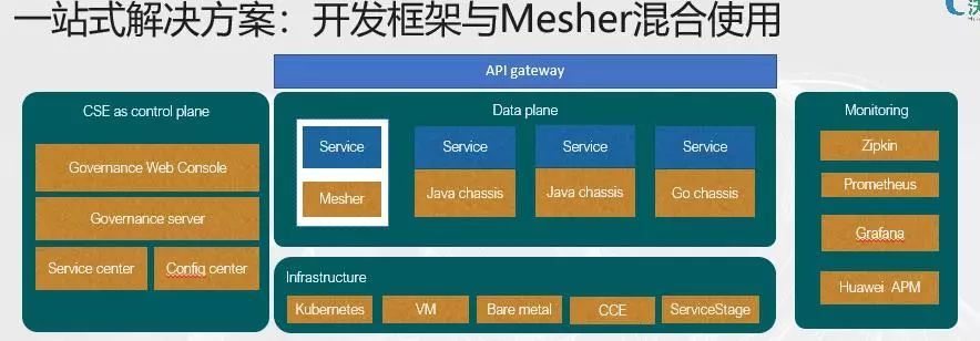 这个是我们的一个一站式解决方案,基于ServiceComb解决方案,Mesher,go chassis等组件,支持java,go语言编程框架和多语言接入,让你使用统一的管理平台进行管理。