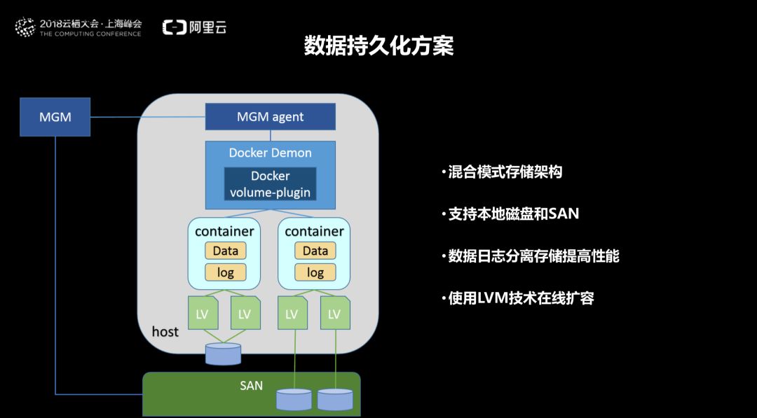 (3)容器持久化数据卷:在容器中运行的应用,应用真正需要保存的数据,可以写入持久化的Volume数据卷。在这个方案中,持久层产生价值,不是通过弹性,而是通过灵活可编程,例如通过设计的API来扩展存储。这个方案结合了持久层和或纯云原生设计模式。