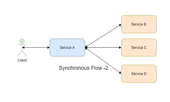 服务B, 服务C, 服务D可以被称为并行——这种场景时将使用服务是相互独立的或服务可能会做一个协调器的角色。