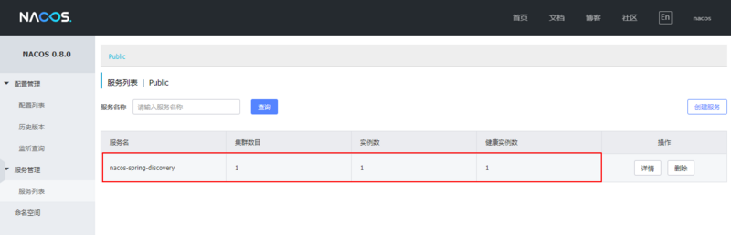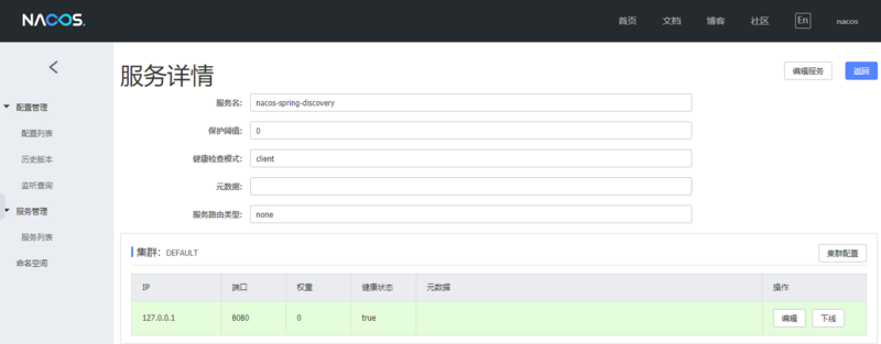 在控制台上,我们可以看到名为nacos-spring-discovery服务实例,点击详情按钮查看实例的详细信息: