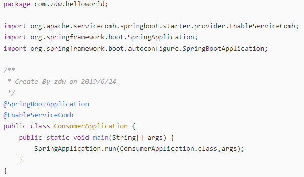 我们会发现,这个启动类比以前我们接触的SpringBoot的启动类多了一个注解:@EnableServiceComb,这个注解的作用就是表明这是ServiceComb应用,启用java.chassis核心功能。很重要的一个注解。
