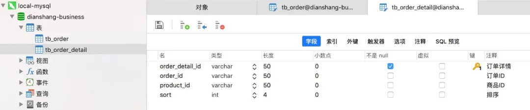 在 dianshang-platform 数据库中,创建订单表 tb_order、订单详情表 tb_order_detail