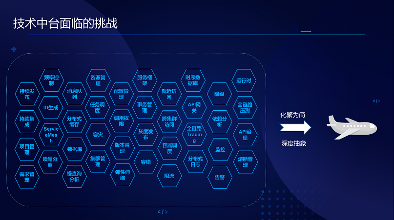 技术中台面临的挑战,框架、运行和支撑怎么联合起来?这个就像造飞机一样,涉及到很多的技术上的挑战,从我综合来说两个词可以总结,一是化繁为简二是深度抽象,把很复杂的东西尽量简单化。