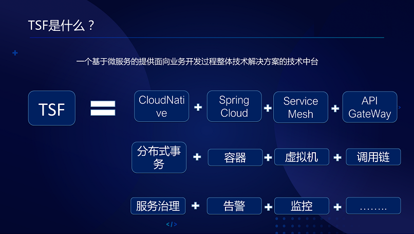 TSF是什么?是一个基于微服务的提供面向业务开发过程整体技术解决方案的技术中台,TSF微服务技术中台核心能力,微服务框架、DeVOPS、服务化能力支撑、数据化运营、服务治理。这个中台我们设计的架构,一个合理业务的中台架构是什么样的,看看我们画的图:外网用户、第三方、CLB、APL