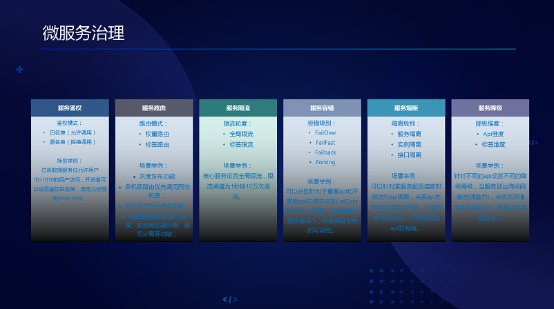 微服务治理有几方面,一是服务鉴权,就是服务能不能调?A能不能调动B,还有就是服务某个条件的用户能调用B的某个接口,配备就可以达到这个能力。二是服务路由,路由是抽象概念,我们提供两种方式,权重路由和标签路由,还有多机房的路由优先。三是服务限流,我针对一些重要的接口可以设置限流能力。四是服务容量,设了四个级别。五是服务熔断,目的是把一些故障的信息踢掉,服务的隔离就是服务故障时候把整个服务全部屏蔽掉,配合容错可以做一些事情。接口隔离是另外一个纬度,如果基于实际的级别统计,有时候是接口本身有问题,可以针对接口可以去做隔离,针对每个接口有不同的失败率;我只把这个接口屏蔽返回确认就可以。六是服务降级,两个纬度,API纬度和标签纬度。