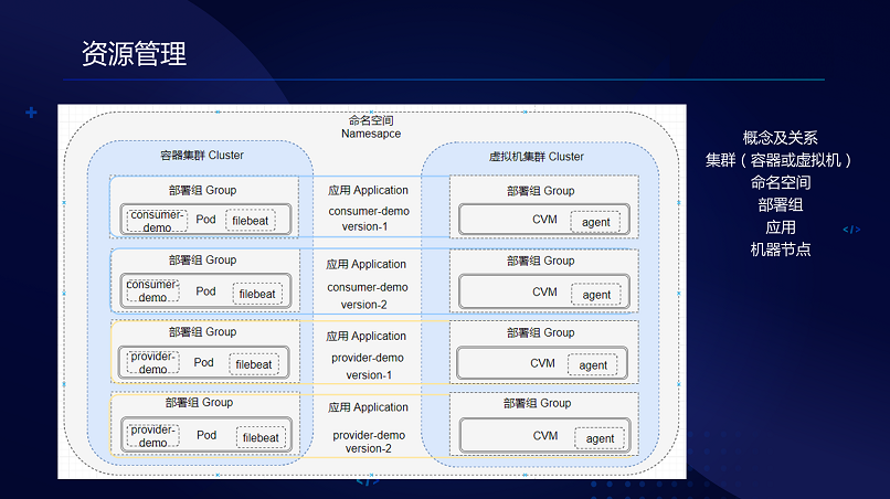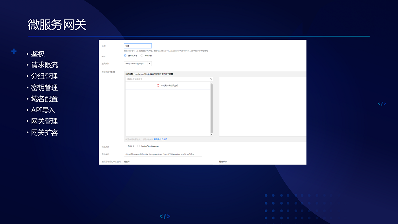 下面讲资源管理的概念,这里用了几个概念,容器,另外一个是命名空间,支持命名空间是跨集群的,两个服务可以互相调用,部署组对于开发,如果传统上把一个架包部署在一批上,就要选一批;另外就是应用,做程序包管理,上了一些包还有一些配置。这是我们的应用管理的,批量部署、版本管理等等。还有分布式配置,配置版本管理、实时更新、灰度发布、多环境发布、动态配置等等。时间有限就过了。全局日志,还有所谓的API治理,要引入SCK,只要加一个注解,就会自动扫描你的API,文档生成等等可以做到自动化。