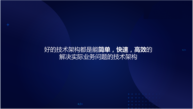 好的技术架构都是能简单,快速,高效的解决实际业务问题的技术架构。技术架构从我角度来说是一个工具,技术就是一个工具,工具的目的是产生收益,是让业务获得更大的收益,我觉得能够快速高效简单的解决业务问题;只要贴合业务,根据业务快速解决业务问题的架构才是好架构,今天分享这么多,谢谢大家。