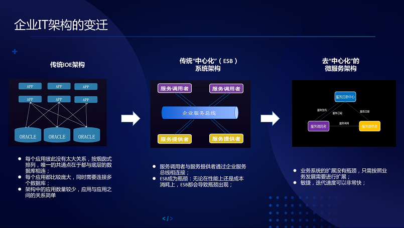 一是互联网的高速发展,导致传统的企业,比如说政府、银行要做很多的架构演进。比如说一个客户,他原来是做保险的,保险的业务可能不是特别复杂,为什么现在要做微服务化?因为它的用户变了,原来是自己的业务员,现在把保险卖到互联网上,我在小程序、淘宝各个互联网入口都有我的用户,用户可以直接买,用户的群体发生变化以后,现在给我们要求是每秒要达到几万,以前一秒十笔,所以带给我们的用户群体庞大。二是敏捷开发,这是非常强烈的刚需,我们有一个客户他的痛点就是十点之前微软给我搞的架构,现在要改一个东西,要六周全部上线,因为所有的点要布到,达到的价值就是持续迭代和价值特性的小批量快速交付。现在我们也进入云化,基础设施服务化、自动化,降低应用部署,升级和管理成本。互联网的架构相对于传统的很多企业,包括政府的机关银行比现在好几个时代,我们很多搞互联网的同学,觉得好像没有特别的挑战,如果你去传统企业看一下,感觉还活在上个世纪,你想像不到现在很多企业还这样,很多时候云计算给大家带来价值,我们可以推动技术的变更和发展。