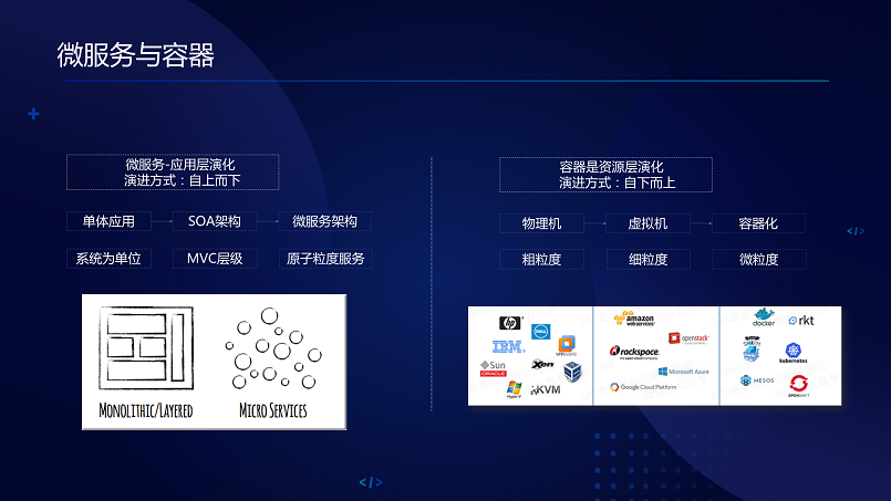 微服务只是架构的理念,容器在微服务里面非常好地把微服务的概念落地,因为它就是一处产生多处运行,微服务其实是架构层面的,是从上而下演进,我们强调的是架构设计上面的概念,容器是资源层面的,我们原来可能计算在IaaS上,之后往PaaS延伸的,把资源进行隔离进行调动,那虚拟机是不是也要到服务器的级别?慢慢延伸出来容器,再讲一下微服务与RPC框架,其实每个公司都有RPC框架,微服务概念没有兴起之前都已经存在了,它跟微服务有关联性,但是没有从本质上改变微服务的架构,其实微服务强调的是一种服务治理,Devops、敏捷,RPC/REST,我们原来做框架的就是强调协议是不是做到相互兼容,还有通讯协议、同步异步、多线程多进程、高性能。