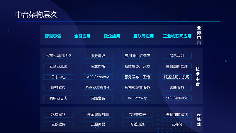 这是中台三个层次,一是云基础设施层,中间是技术中台,这一块也是我们最擅长的,三是业务中台,面对不同行业的应用,可能有行业同学他们会主导做这个事情。这是一个传统的零售中台架构,网关技术中台、服务器各种业务中心,典型的一个零售业务中台架构。