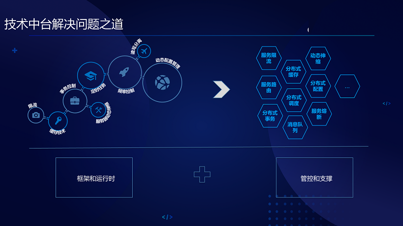 技术中台怎么解决问题?设计一个技术中台,可能要服务限流,服务路由,分布式缓存等等能力,这些能力怎么组合起来,做一个中台应该包括两部分,就是管控和支撑,支撑就是你的能力,对应一些后端,比如说限流服务器这些能力就是支撑,管控就是管控一些管控平台,我把它控制好,包括框架和运行时;所以我们把它叫做框架和运行时和管控和支撑。