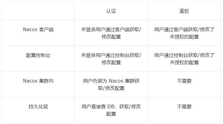 在默认的 Nacos server 配置中,不会对客户端鉴权,即任何能访问 Nacos server 的用户,都可以直接获取 Nacos 中存储的配置。比如一个黑客攻进了企业内网,就能获取所有的业务配置,这样肯定会有安全隐患。